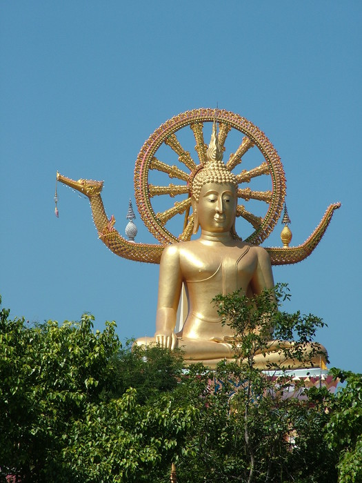 Главная гордость Самуи это 12-ти метровая статуя позолоченного Биг Будды (Big Budda), сидящего в позе лотоса. Биг Будда расположился на вершине маленького острова Фан, соединенного с Самуи узкой дамбой и проложенной по ней дорогой. Биг Будда легко заметен еще на подлете к острову Самуи, его статуя является своеобразной визитной карточкой острова. Для местных жителей статуя Биг Будды – это самое почитаемое и священное место, имеющее глубоко религиозный смысл. Поднявшимся к Биг Будде посетителям, открывается потрясающий вид на морскую гладь Сиамского залива и соседний остров Ко Панган (Koh Phangan). При статуе Биг Будды находится действующий буддийский храм Ват Пра Яй (Wat Phra Yai) и школа. В школе каждый желающий может постичь основы философии буддизма и обучиться технике медитации.